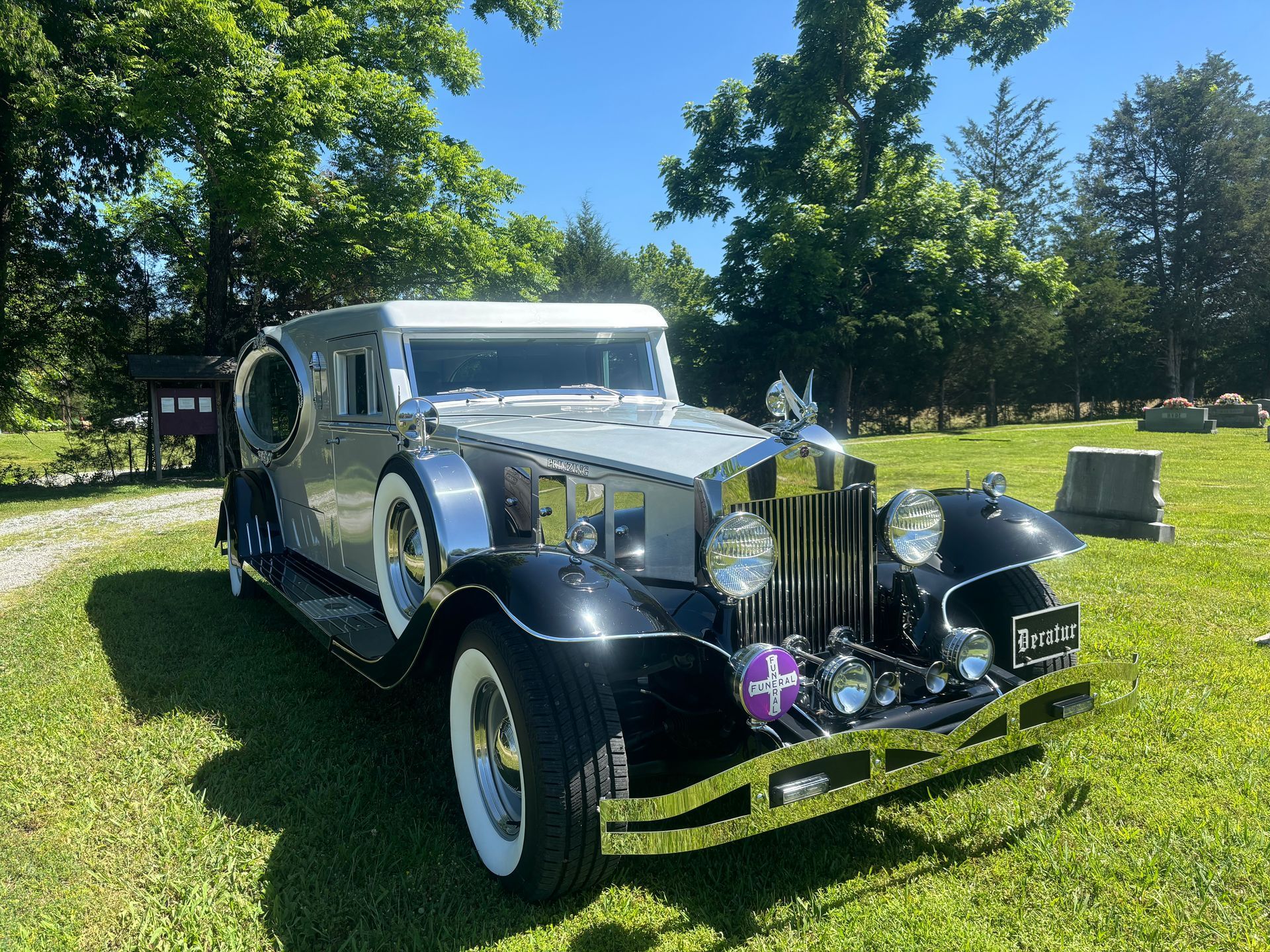 A 2023 Rosewood Prinzing, the hearse was custom built for us by Rosewood Classic Coaches in Arkansas. They are well-known for their skills and only build one vehicle at a time. The sleek design includes elements from the Rolls Royce, Packard, and Duesenberg, in addition to special touches inspired by the horse-drawn era.